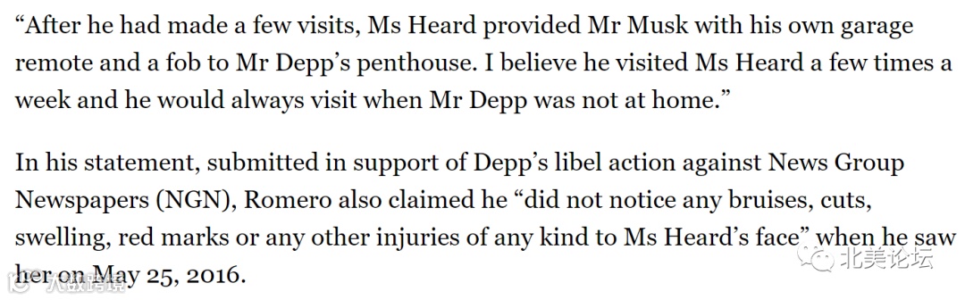 “在马斯克拜访了几次之后,希尔德给马斯克提供了他自己车库的遥控器和德普顶层公寓的fob。我相信他每周都会去希尔德太太家几次,而且总是在德普先生不在家的时候去。”