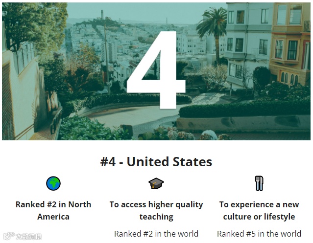 英国在“获得更高水平教学”这一项上位居榜首:牛津剑桥两大王牌学府、G5金砖五校,再加上又是世界金融中心,这些全球顶尖的优质资源吸引着来自全球各地的留学生。在QS发表的《2019年全球最佳留学城市》中,伦敦位居第一。此外,英国在“体验新的文化或生活方式”上排第四:从下午茶到酒吧,城堡到高地,伦敦的繁华城市到爱丁堡的中世纪街道,课外之余,你可以在这里享受全新的文化体验(注:当然,除非你是美食爱好者)。