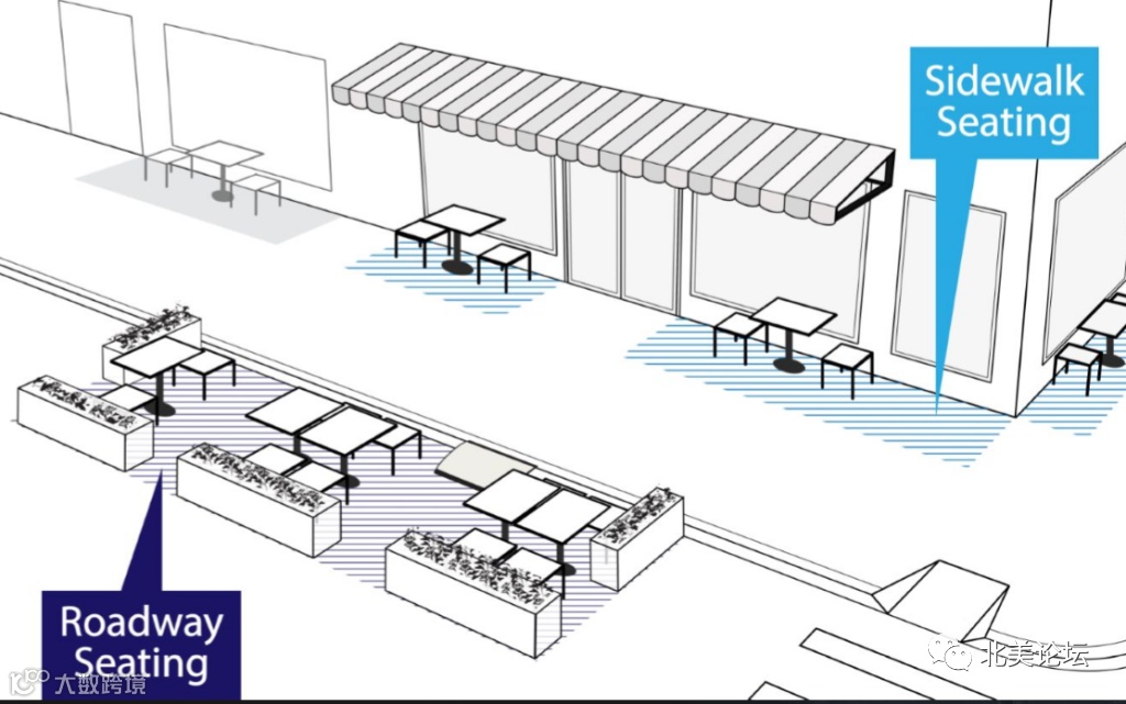 -路边座位:路边座位区域不能超过店铺门脸的长度,并与通道之间有分开的屏障(盆栽植物,路障)。不适合路边座位的禁区,包括带有“No Standing Anytime”的路缘、巴士站、以及消防栓15英尺以内的地方等