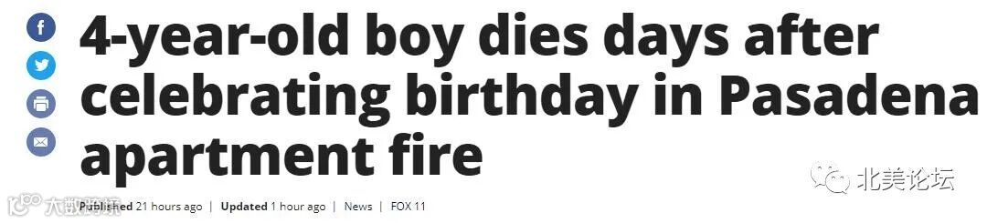美国时间7月30日(周四)根据《Fox 11》报道,4月29日下午,位于洛杉矶帕萨迪纳市一公寓大楼发生火灾,一名4岁男孩被烧死。消防官员表示,他的母亲和弟弟也在火灾中严重受伤。据死者家属表示,悲剧发生前几天,这名年轻的受害者刚过了四岁生日。