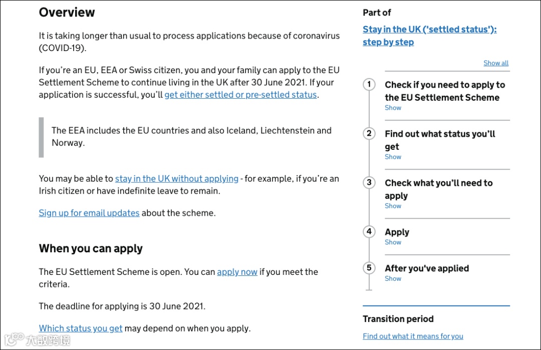 从英国政府GOV官网给出的官方信息可以看到,申请EU Settlement Scheme(欧盟定居计划)的截止时间是2021年6月30日。可以申请该签证的包括欧盟公民或者欧盟公民的非欧盟家属。