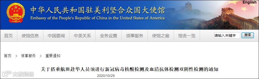 其中,对新冠检测的具体要求有三点,以中国驻美国大使馆发布的通知为例: