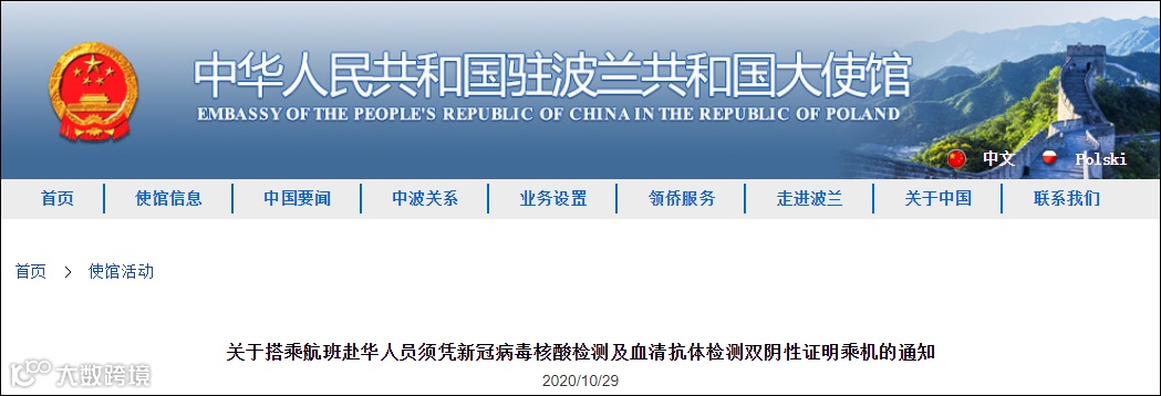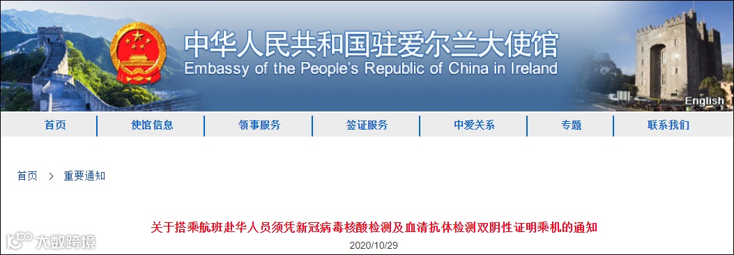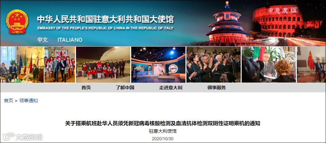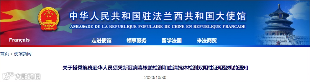 导读:我国从10月29日起,中国驻美国、法国、英国、爱尔兰、意大利、波兰、俄罗斯等多个国家的大使馆网站陆续发布《关于搭乘航班赴华人员...通知》