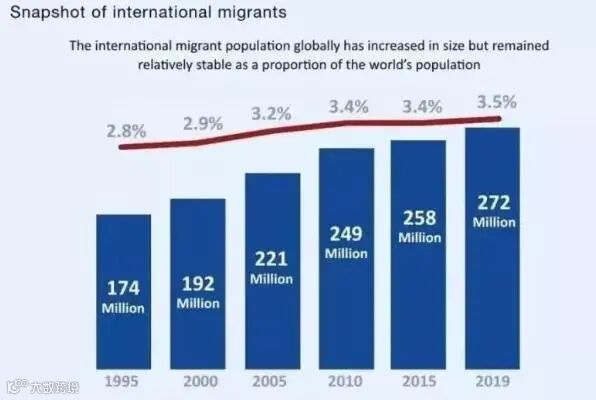 报告引用2019年联合国经社部关于全球国际移民存量的一项数据称,截至2019年,全球的国际移民已经达到2.72亿人,占全球人口的3.5%。中国大陆以约1073.23万的输出移民成为世界第三大移民输出国。