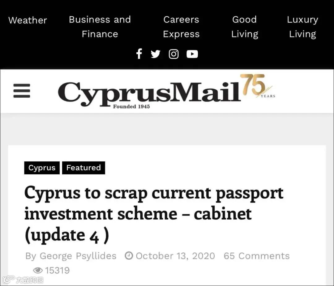 10月中旬,塞浦路斯政府发言人在内阁紧急会议后发表了声明,塞浦路斯移民投资入籍计划,将于11月1日停止。在此之前一位记者通过调查发现,有数十名塞浦路斯护照项目的申请人正受到犯罪调查、国际制裁,甚至正在服刑。