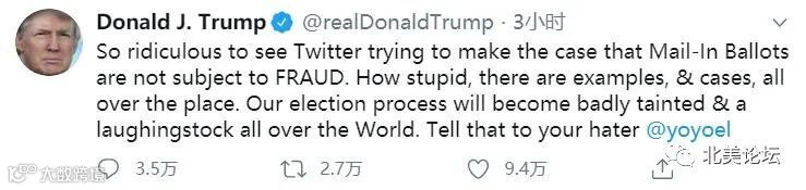 5月26日(周二)首次在川普总统的一条批评邮寄投票的推文上贴上警告标签,声称“没有根据”说法。川普随后马上发两条推文严正回应,指出Twitter正在干预2020总统大选。