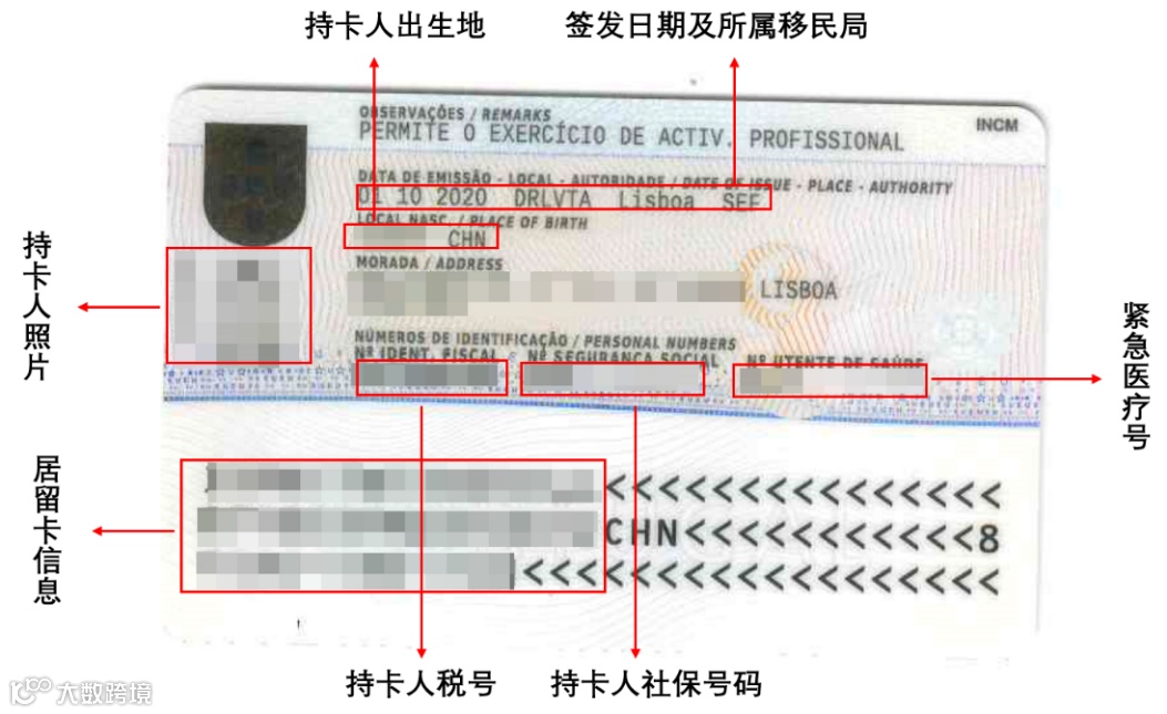 卡片的签发日期、投资人递交的葡萄牙SEF地点信息、出生地点和税号信息在背面显示。