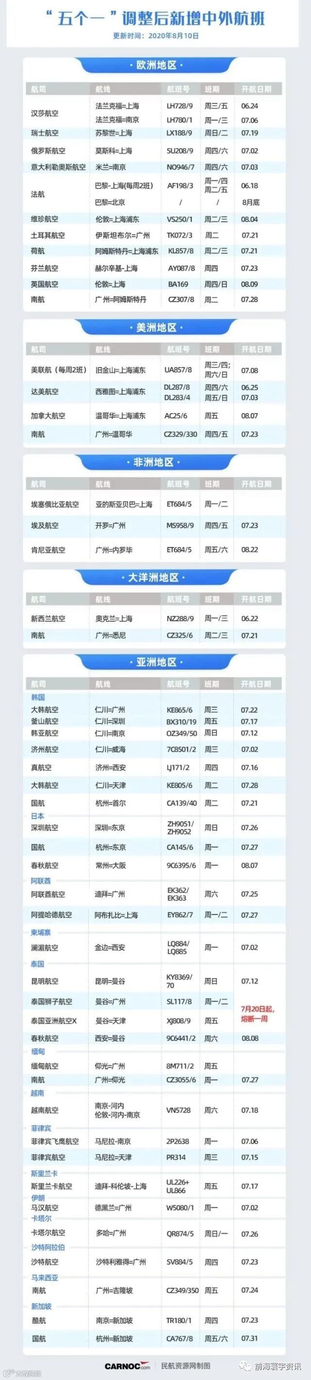 奥克兰-广州航线2020年8月-9月每周两班,具体计划如下: