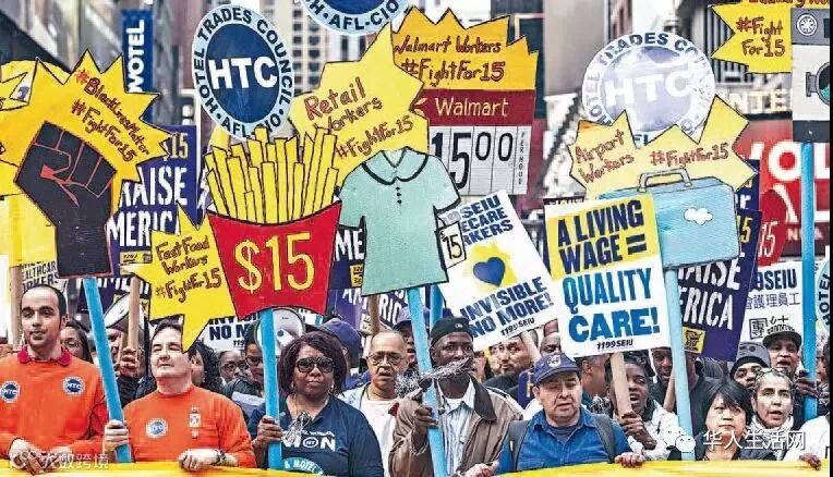 图为2016年争取提高时薪大规模示威。。Robert Stolarik/纽约时报