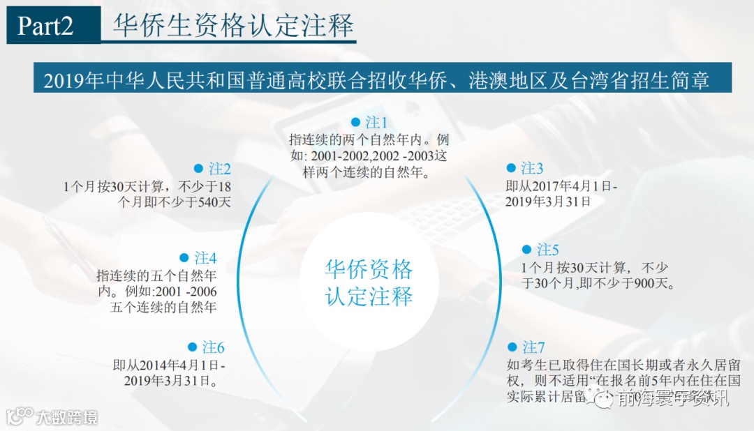 若考生本人或其父母一方未取得住在国长期或永久居留权,但已取得住在国连续5年以上(含5年)合法居留资格、5年内注4在住在国累计居留不少于30个月。且考生本人在报名前5年内热在住在国实际累计居留不少于30个月的,也可参加报名中国公民出国留学(包括公派和自费)在外学习期间,或因公务出国(包括外派劳务人员)在外工作期间,均不视为华侨。
