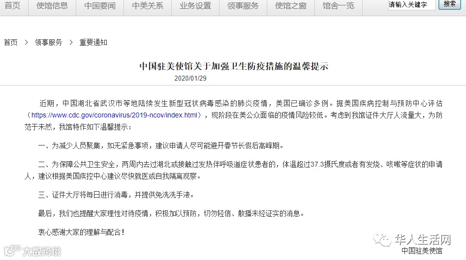 发布通知的同时,为了防止疫情扩散,中国驻美使领馆发布了加强卫生防疫措施的提示。