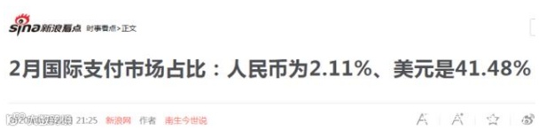 2020年2月,美元国际支付市场占比41.48,他的老对手欧元降低至32.61%,人民币不过2.11%而已。