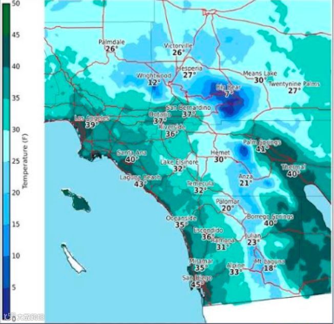 国家气象局预计,星期四晚至星期五上午,南加将再度降温,寒冷刺骨。华人聚居的圣盖博谷、橙县尔湾等地,最低气温仅为40度(大约4.4摄氏度),接近冰点。民众注意防寒保暖,不要将敏感的植物和宠物留在室外。