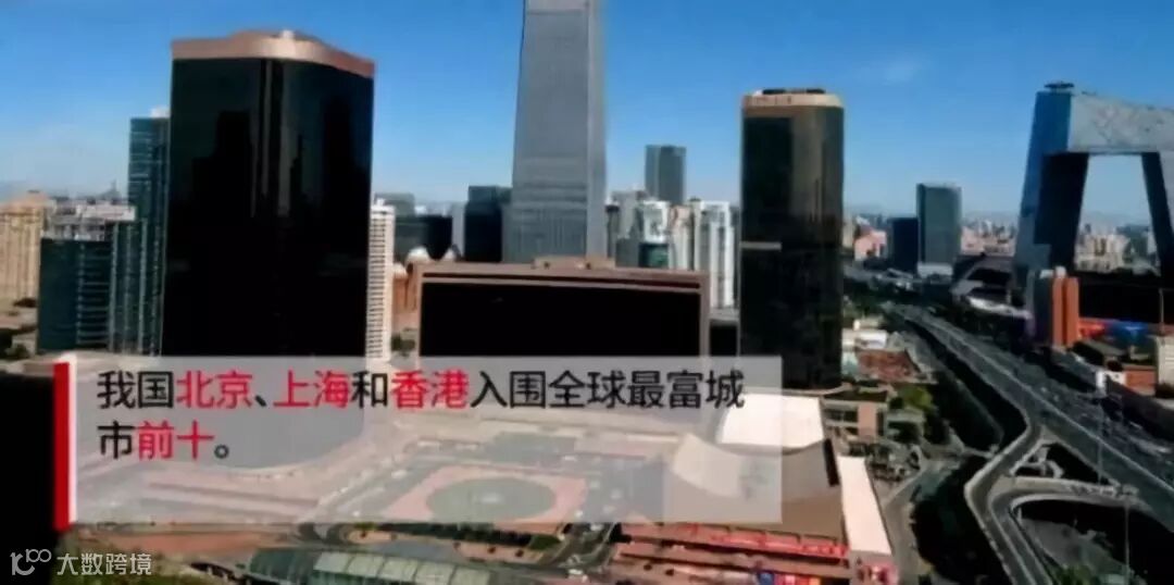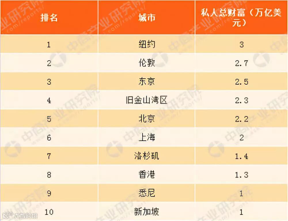 北京排在全球最富城市排行榜的第五位,财富总额为2.1万亿美元,紧随其后的是上海(1.9万亿美元)。香港排在第八位,财富总额为1.2万亿美元。深圳的财富总额为7,500亿美元,排在第20位。