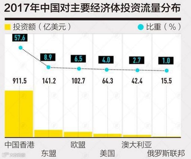 《公报》称,2018年,中国对外直接投资涵盖国民经济的18个行业大类,其中租赁和商务服务、金融、制造、批发零售等4行业投资占比超七成,流向信息传输、科学研究和技术服务、电力生产、文化教育等领域的投资快速增长。租赁和商务服务、批发零售、金融、信息传输、制造和采矿等六大领域存量规模均超过千亿美元,总规模占中国对外直接投资存量的84.6%。