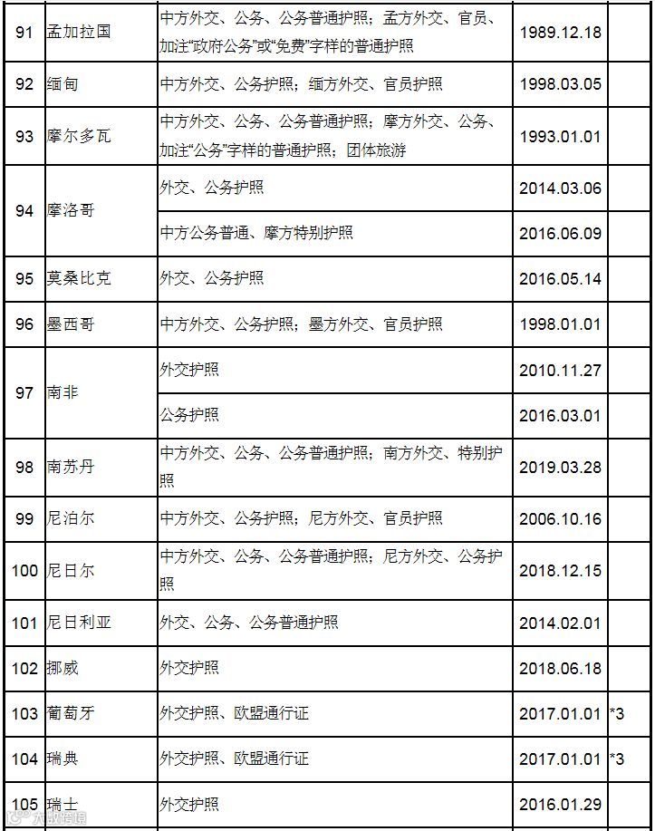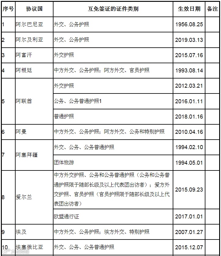 截至目前,中华人民共和国与下列国家缔结互免签证协定(更新至2019年5月2日)。中国公民持所适用的护照前往下列国家短期旅行通常无需事先申请签证。