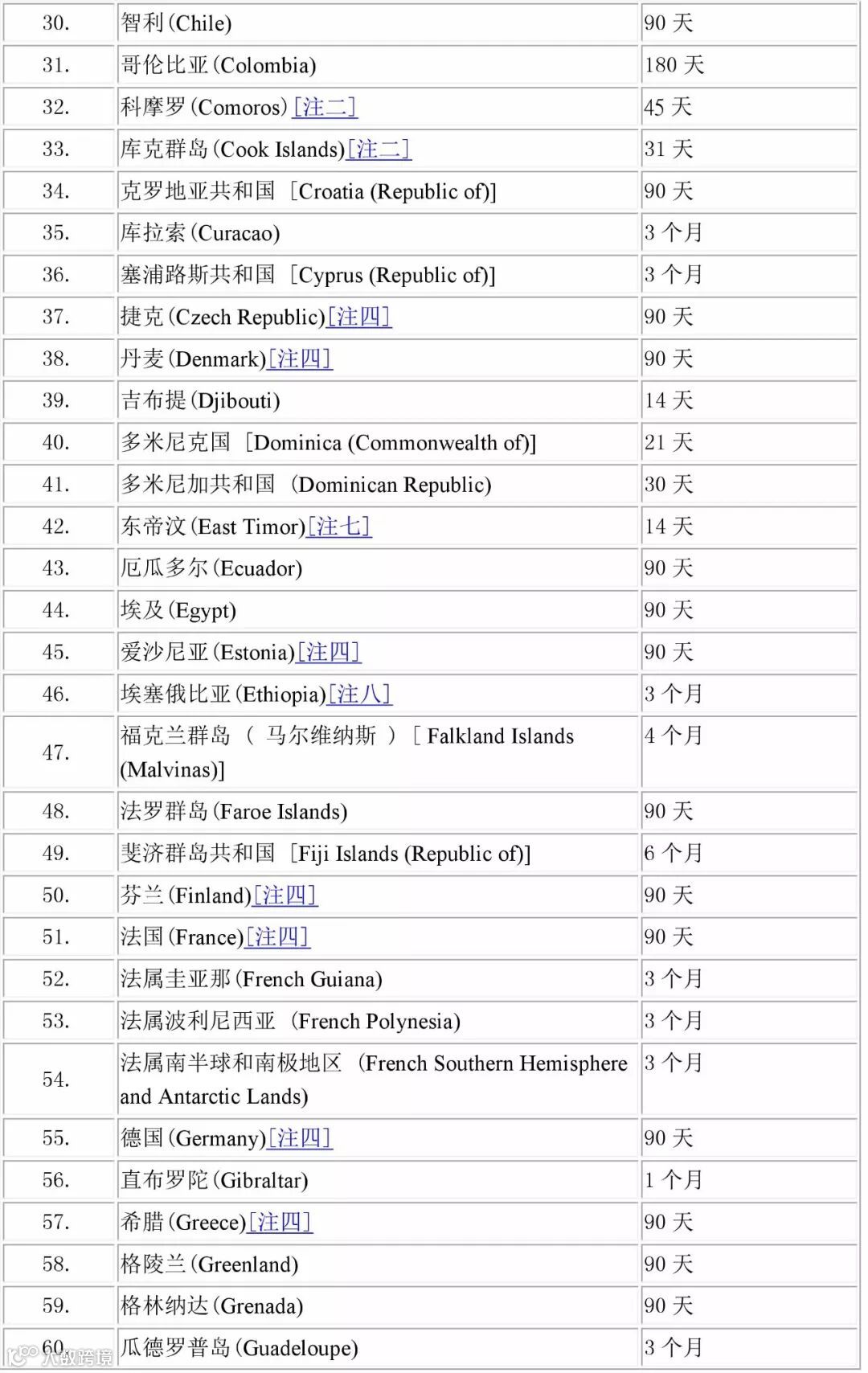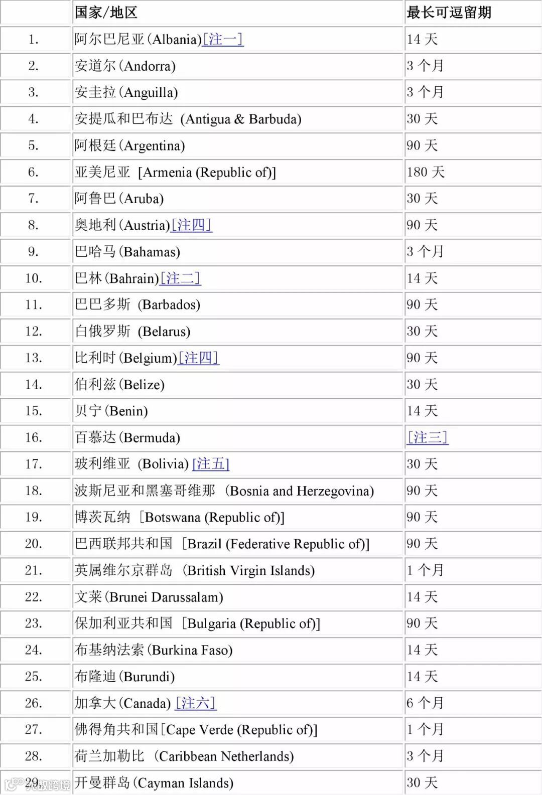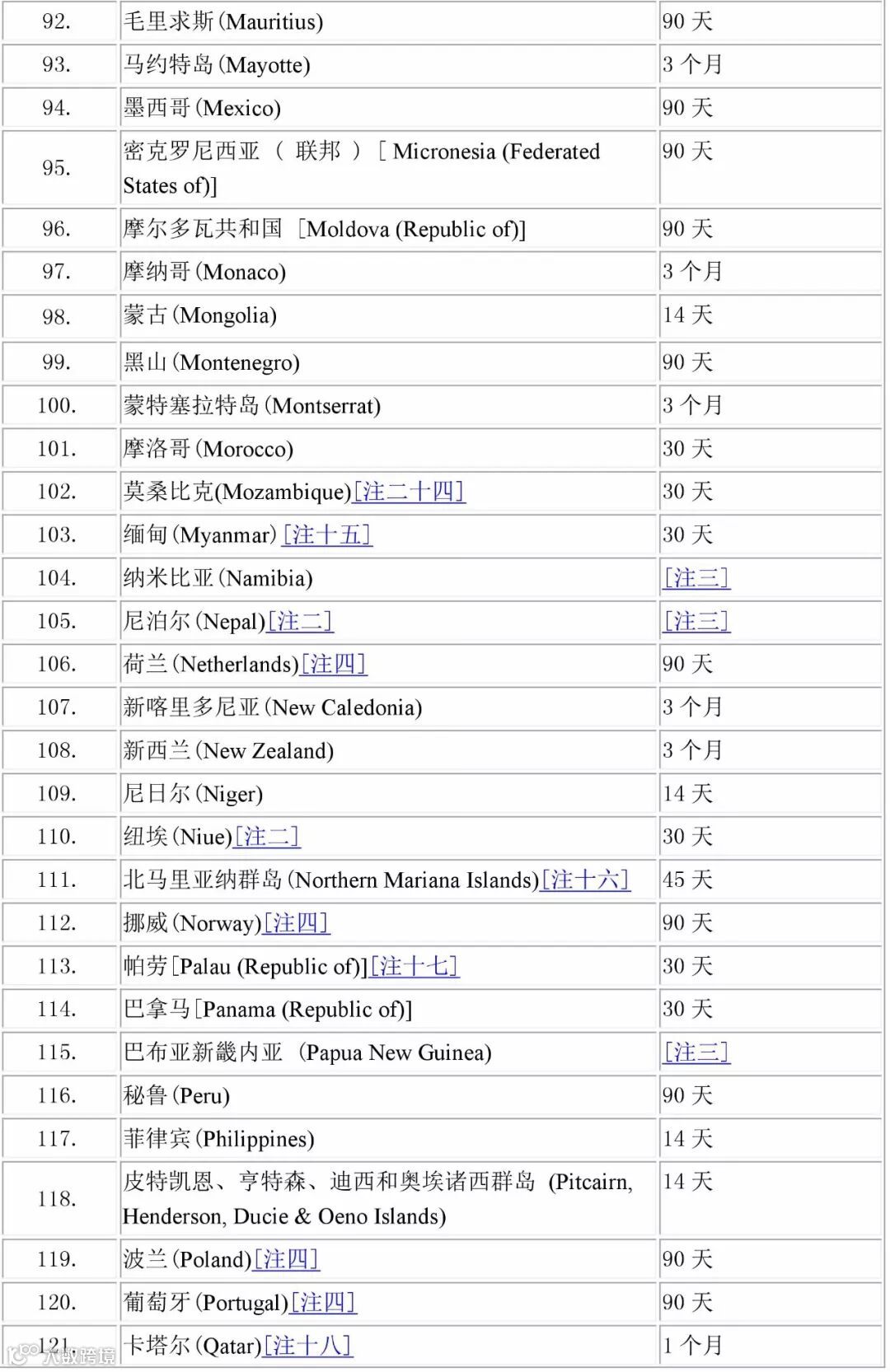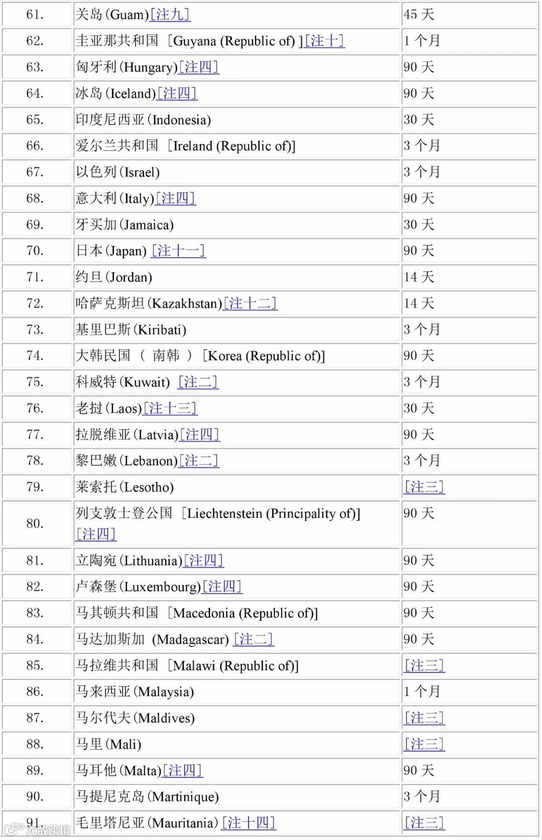 注一 :香港特区护照持有人可享有免签证入境待遇,最长可逗留十四天,而总逗留期限为180天内不得超过90天。