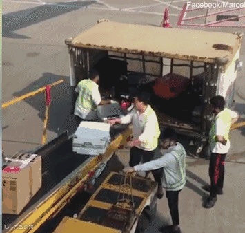 就连上面贴着“易碎物品”标签的箱子,也照扔不误!