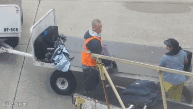 从视频可以看出,当时,传送带上每过来一个行李箱,这两名工作人员就会十分粗暴地把箱子“扔”进行李车,丝毫不care会不会把里面的东西摔碎。