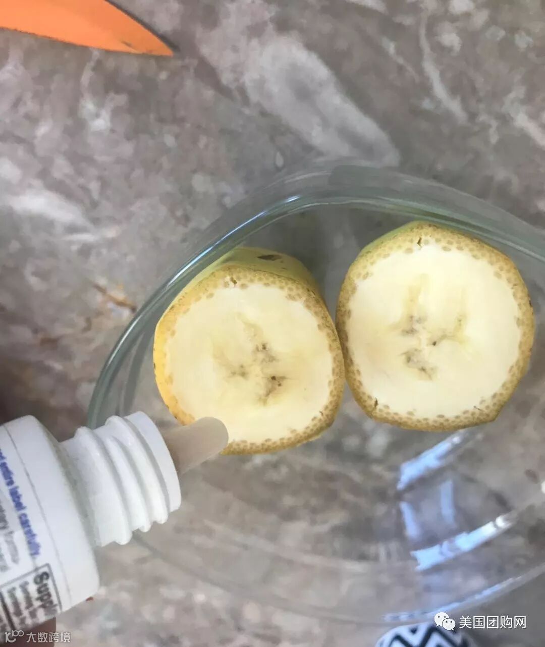 切开香蕉,在香蕉上面,一个滴上了CellFood细胞水,一个没有。