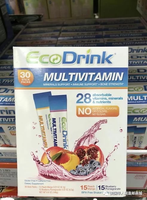 EcoDrink多种维生素生态饮料,富含31种高吸收维生素,矿物质,营养健康。 天然香料及色彩改良配方。不加糖/卡/碳水化合物/ 咖啡因,非常适合整个家庭哦。每盒30袋,芒果桃子口味15袋,石榴蓝莓口味15袋,并配原装摇动筛瓶一个。(瓶子大约600ml)