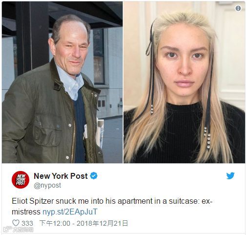 前纽约州长史毕泽(Eliot Spitzer)风流情史峰回路转,之前被情妇翠薇丝(Svetlana Travis Zakharova)指控虐打勒颈,最终女方却反遭控告盗窃,被判入狱90天。