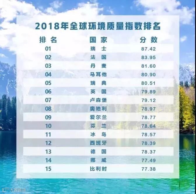 在此次全球环境质量指数排名中,瑞士以优美的环境和清新的空气排名第一,法国、丹麦分别未来第二、第三,地中海最受欢迎的岛国马耳他则位列第四,全球环境质量指数排名靠前。