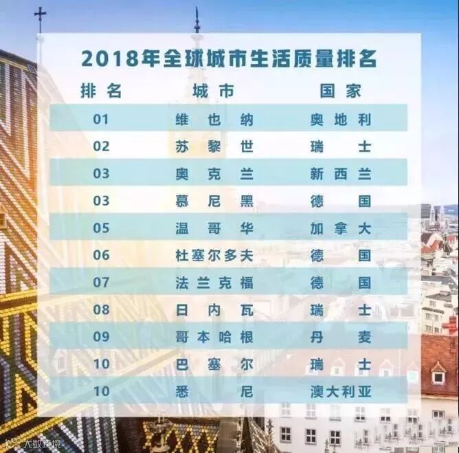维也纳连续九年领跑总体生活质量排名,苏黎世排名第2位,奥克兰和慕尼黑并列第3位,第5位是温哥华,同时它也是北美排名最高的城市。杜塞尔多夫、法兰克福和日内瓦、哥本哈根紧随其后,排名第六至第九,巴塞尔和悉尼排名第十。