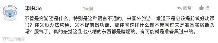 网友:不管是穷游还是什么,特别是这种语言不通的,来国外旅游,难道不是应该提前做好功课吗?你又没办法沟通,又不提前做功课,那你就这样什么都不带就过来是准备露宿街头吗?服气了,真的感觉这乱七八糟的东西都是瞎掰的,有可能就是准备黑过来的。