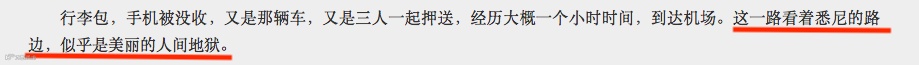 小露被押送着来到悉尼机场,她形容着,“这一路看着悉尼的路边,似乎是美丽的人间地狱。”