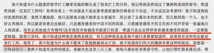 没有去其他地方有错吗?还有我没有取钱没有提前订机票,难道只是走走停停看看感受感受的旅游,一定要提前取钱,提前订房吗,我不知道这种观念竟然是规定,而且这种观念还是每个旅行者都要知道的,如果没有这些凭证就是来打工的,我笑了,我不知道为什么我不能来了取钱换钱再去订房,我不知道你们伟大的澳洲有着这样的规定。我想我一定特别落后,竟然不知道有这样的规定。