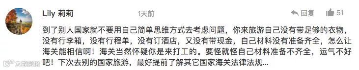网友:到了别人国家就不要用自己简单思维方式去考虑问题,你来旅游自己没有带足够的衣物,没有行李箱,没有行程单,没有订酒店,又没有带现金,自己材料没有准备齐全,怎么让海关能相信啊!海关当然怀疑你是来打工的。要怪就怪自己材料准备不齐全,运气不好吧!下次去别的国家旅游,最好提前了解其它国家海关法律法规...