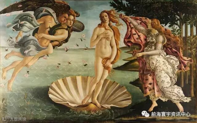 爱神在从海浪中降临, 伴随着海风的号角声;