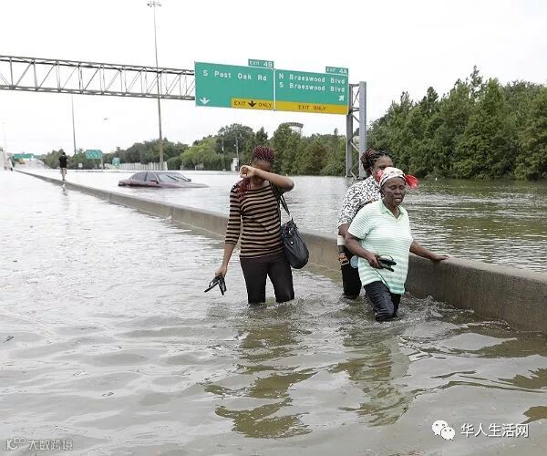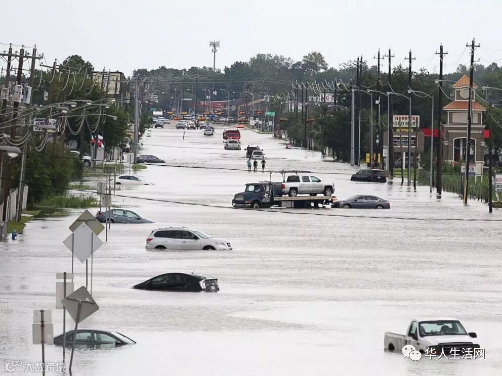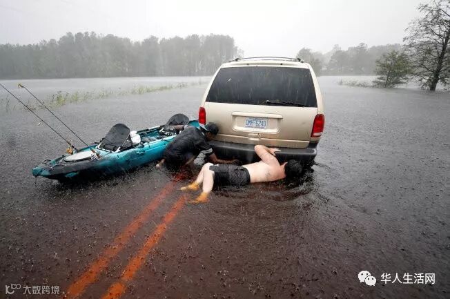 一辆厢形车在北卡州滚泉湖抛锚在路中,两名驾船路过的男子冒险在洪水中修车