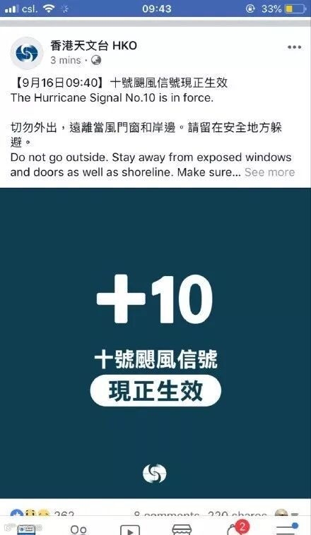 在香港发布10号风球后,澳门也在11点发布10号风球,这是继天鸽之后,山竹再次诱发“港澳双十”。