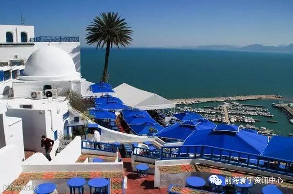 突尼斯的“蓝白小镇”,位于它的首都突尼斯城的东北部,坐落在地中海边高高的峭壁之上。“蓝白小镇”所有的房屋只有两种颜色:白色的墙和蓝色的门窗、屋顶,小镇也由此而得名。简洁明快的色泽对比使得这座混合着简约和优雅的海岸小镇成为全球独一无二的绝版。它紧靠着迷人地中海,也接收着火热撒哈拉沙漠散发的巨大热量,被人认为具有“海水与火焰”的双重性格。众多画家和摄影家、背包客和追随浪漫的情侣纷纷以火焰般的热情投入它的怀抱。
