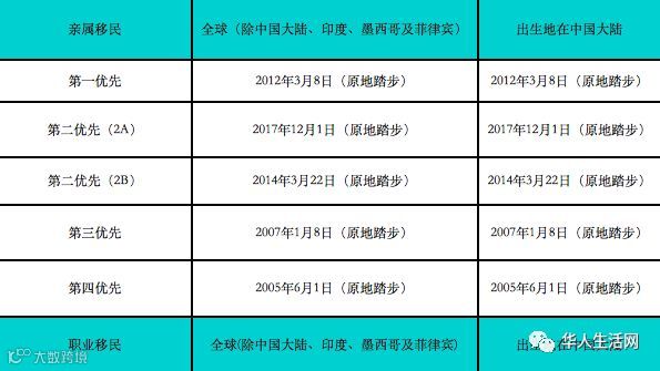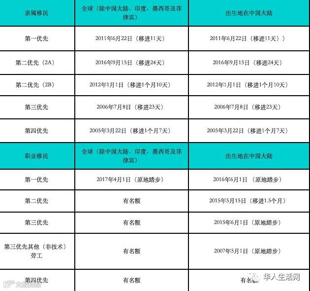 “递交申请排期”方面,港澳台及中国大陆出生申请人的亲属移民及职业移民的排期,都没有变动。