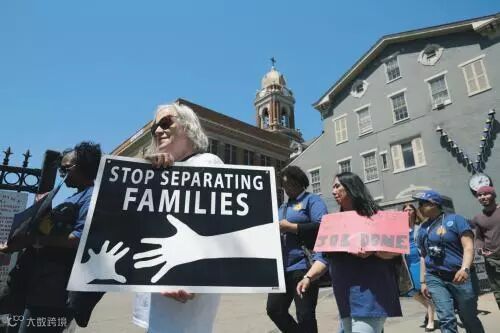 一些同情移民的组织打着标语牌要求停止“骨肉分离”。美联社
