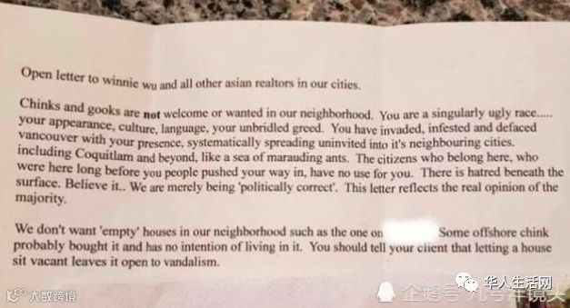据yahoo新闻9月26日报道,在加拿大不列颠哥伦比亚省当房产中介的华裔女子温妮·吴(音)最近在脸书上曝出一封极端种族主义者恶意满满的信件: