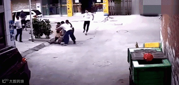 这些人把画面中可怜求救的父亲扑倒在地,殴打他,并且大声地叫喊着: