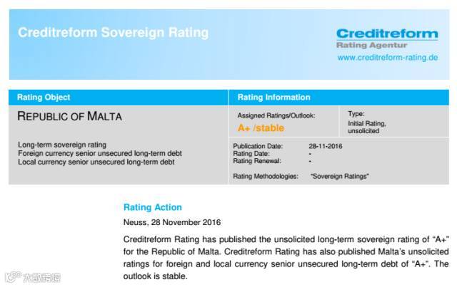 2016年11月28日,德国评级公司Creditreform给予马耳他A+资信评估,是对马耳他稳定前景的第一次评级。