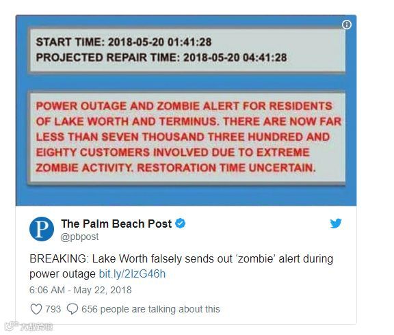 据USA Today报道,5月20日,莱克沃斯市发出停电和丧尸警报:“警告,莱克沃斯市和终点站的居民需要面对停电和丧尸危机。目前因极端丧尸活动而受波及的客户远远不到7380人。恢复时间尚不确定。”