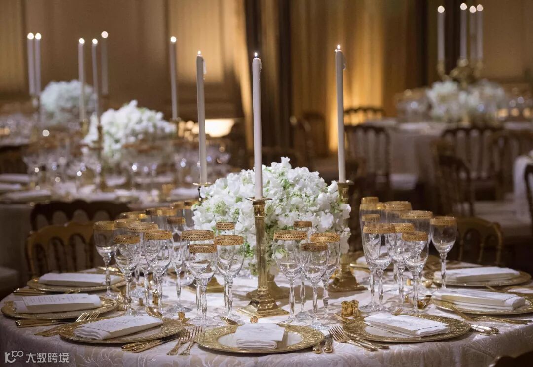 川普总统夫妇欢迎法国总统马克宏夫妇的国宴餐具。(路透)