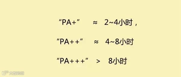 PA: Protection of UVA-1,产品对于UVA的防护能力,UVA是造成光老化的因素。PA的防护程度是以+,++,+++三种强度来标示,“+”字越多,防止UVA的效果就越好。