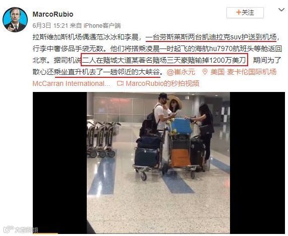 据网友爆料,有人在美国拉斯维加斯机场偶遇了李晨和范冰冰,一台劳斯莱斯和两台凯迪拉克suv护送到机场,行李中奢侈品手袋无数,目前两人已经回国。而根据网友爆料,送范冰冰和李晨去机场的司机透露,二人在赌城大道某著名赌场三天豪赌输掉1200万美刀,期间为了散心还乘坐直升机去了一趟邻近的大峡谷。