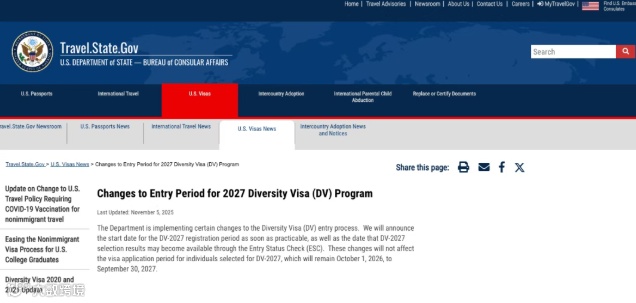 尽管报名时间推迟,但已明确的是:2027 财年 DV 计划中签者的签证申请期不受影响,仍为 2026 年 10 月 1 日至 2027 年 9 月 30 日。中签者可在该时间段内按要求提交签证申请,无需担心因报名延迟导致后续申请时间压缩。