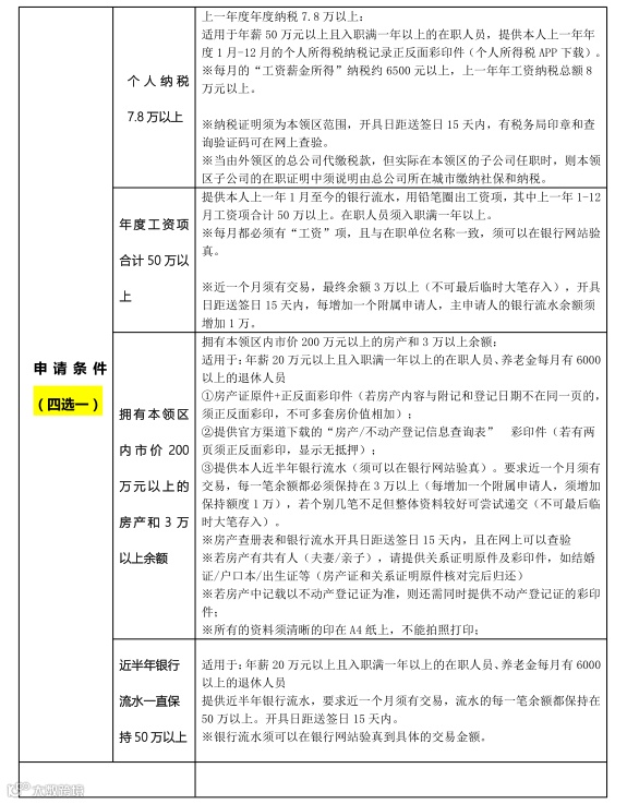 高纳税证明:上一年度个人纳税总额达7.8万元以上(月薪约6500元,年薪50万元以上),需提供纳税记录。