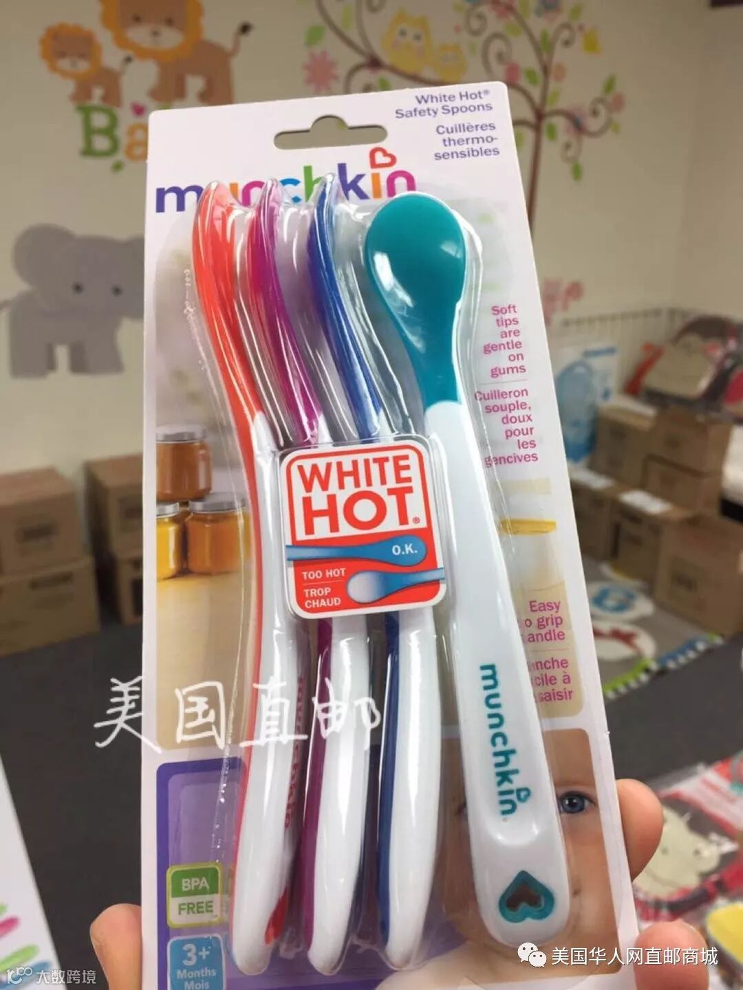 此款munchkin获国际婴幼儿大奖产品!现在不用再喂宝宝前再尝试一下是否过热了,如果温度超过宝宝承受的高温标准(43.3度),小勺会自动变成白色。