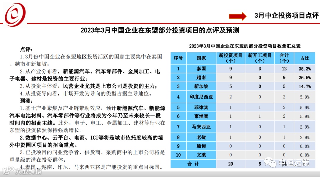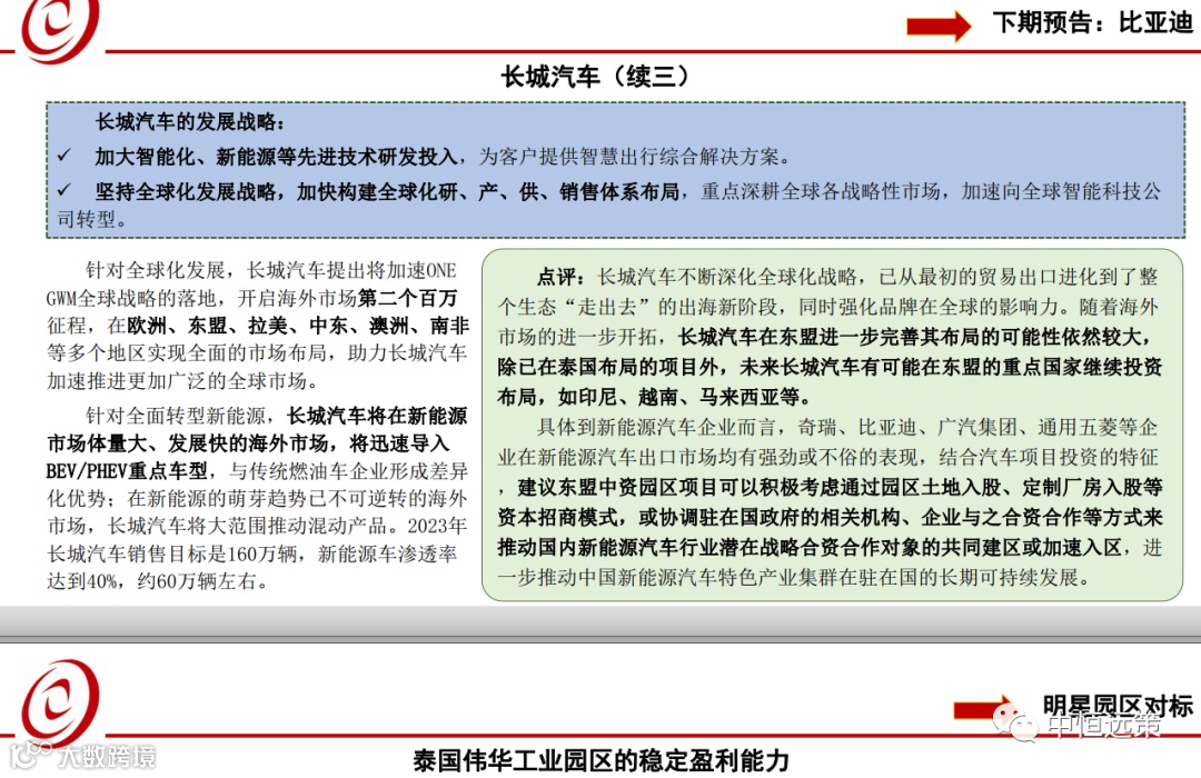 近期,媒体分别报道比亚迪与印尼签署合作备忘录、长城汽车拟投资3000万美元在泰国建厂两则新闻,这与我们公司开发的“中国海外园区项目招商参考指南—东盟版3月刊”的预测观点有多处吻合,比如东盟中资园区招商主线的预测“基于产业聚集及产业链带动效应, 预计新能源汽车、 新能源汽车电池材料、 汽车零部件等行业将成为今年乃至未来较长一段时间内的招商主线。”