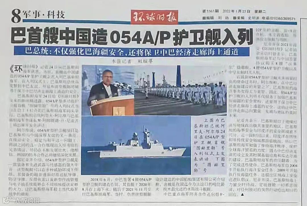 1月24日,由中国船舶沪东中华建造的首艘054A/P型护卫舰正式入列巴基斯坦海军,对此《环球时报》作了详细报道。在入列仪式上,巴基斯坦总统高度赞扬中巴友谊,并宣布该型舰艇将被用于保卫中巴经济走廊海上通道的安全。